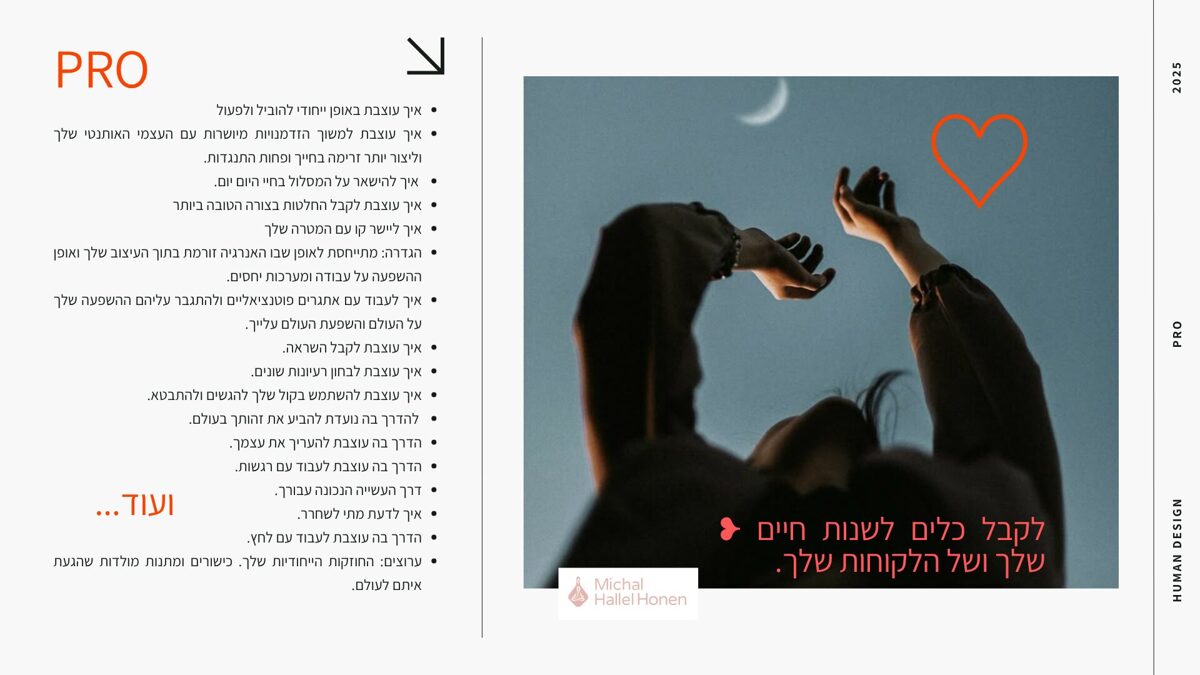 מעל הכל אני מעודדת אותך להקשיב ללב שלך ולסמכות הפנימית שבתוכך להדריך אותך בבחירת כל דבר, גם בחיבור ביננו.